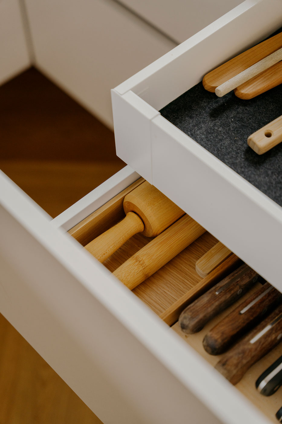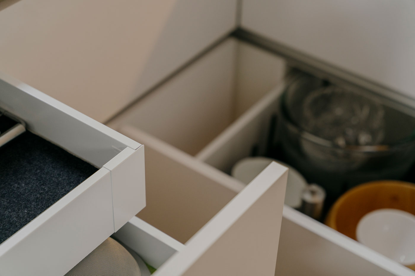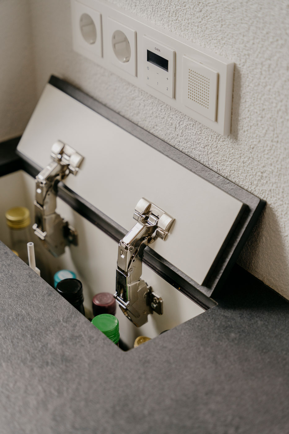 - In die Arbeitsplatte integriertes Fach für Essig, Öl und Flaschen.