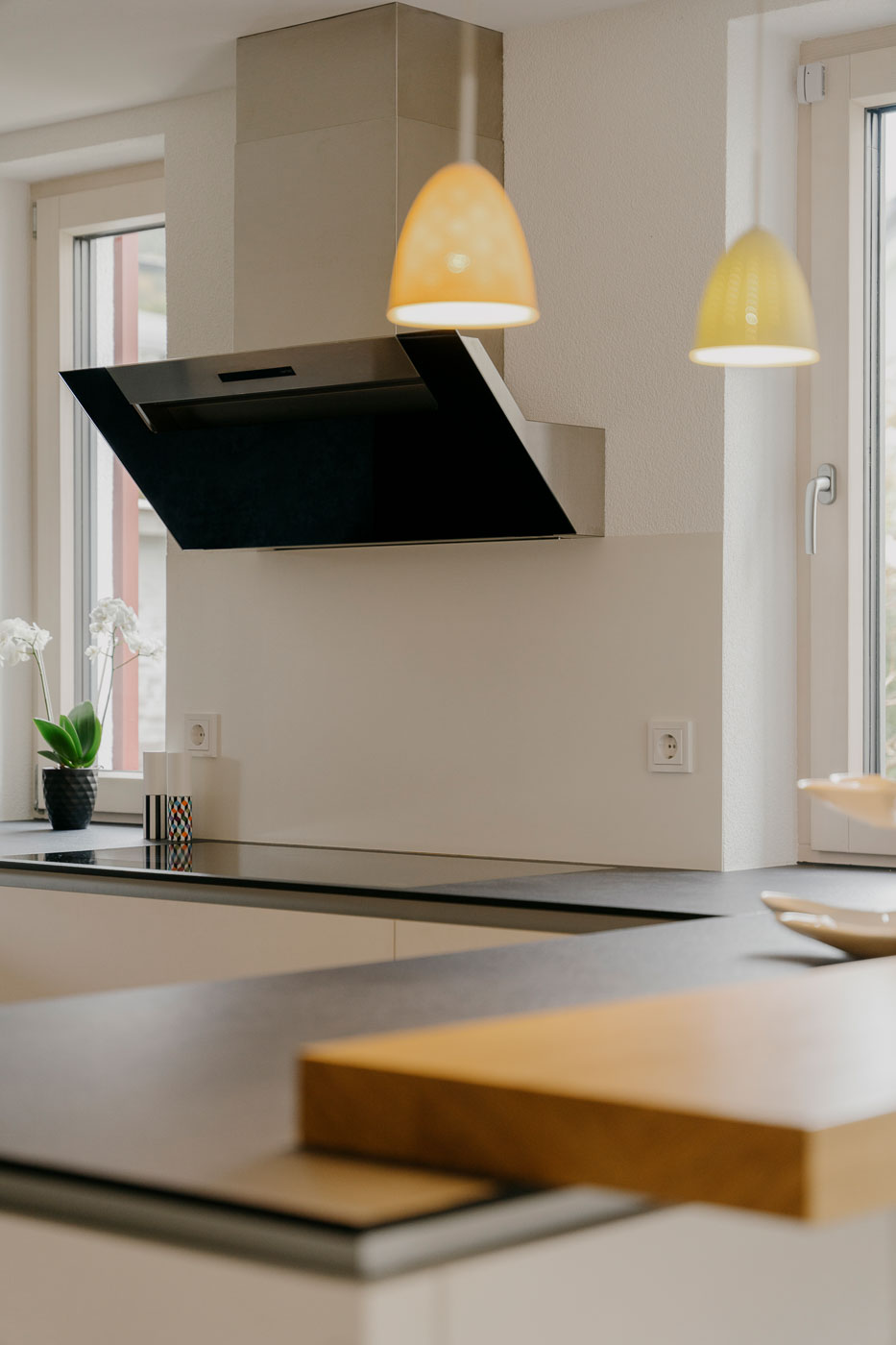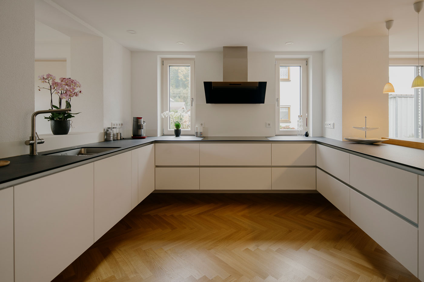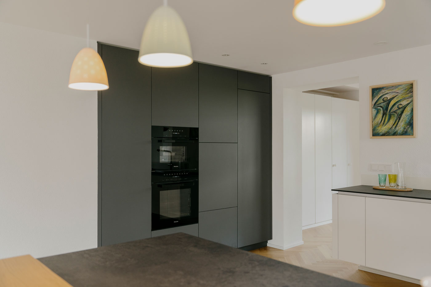 Diese Einbauküche begeistert mit einem eleganten Design und durchdachten Funktionen. Die schwebend montierten Unterschränke verleihen der Küche Leichtigkeit und lassen sie optisch größer wirken. Hochwertige Materialien wie dunkler, grauer Fenix und reinweißer Egger-Schichtstoff mit Anti-Fingerprint-Eigenschaft schaffen eine moderne und gleichzeitig pflegeleichte Ästhetik.