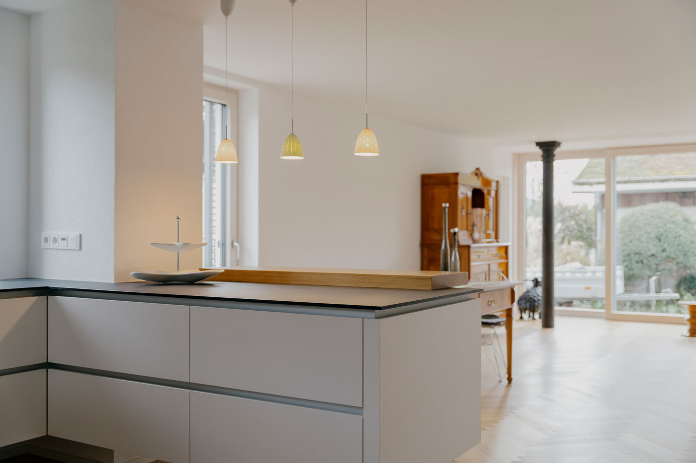 Die Hochschränke sind komplett grifflos und mit Tip-On ausgestattet. Abgerundet wird das Design durch eine elegante Thekenplatte aus Eiche, die Wärme und Natürlichkeit in den Raum bringt. Ein absoluter Hingucker und Lieblingsplatz für Sie und Ihre Gäste.