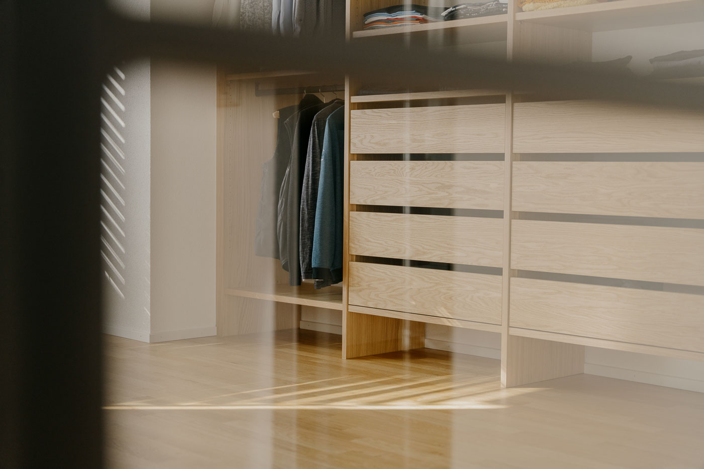 Für unseren Kunden durften wir einen maßgefertigten Schrank aus Eiche furniertem Holz fertigen, der perfekt zum Boden und dem Einrichtungsstil des Schlafzimmers passt. Das matt lackierte Eichenholz sorgt für eine natürliche und hochwertige Optik, während schwarze Akzente wie Kleiderstangen und Garderobenlifte dem Möbelstück einen modernen Touch verleihen.