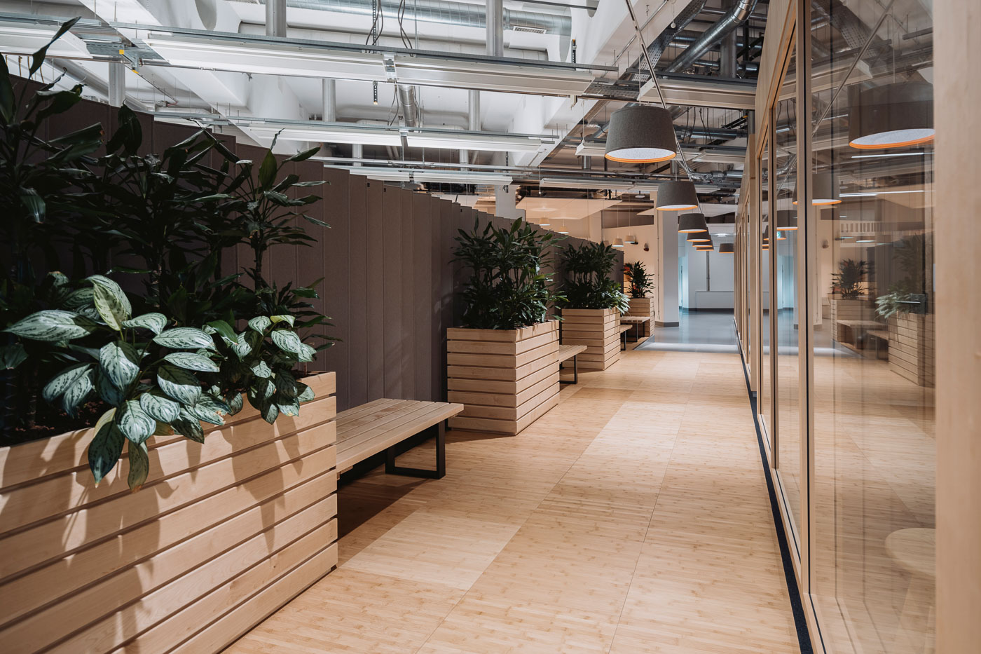 Zusätzlich stammen auch die Pflanzkästen mit integrierten Sitzbänken aus unserer Werkstatt. Sie gliedern die Durchgänge und laden zum kurzen Verweilen ein.