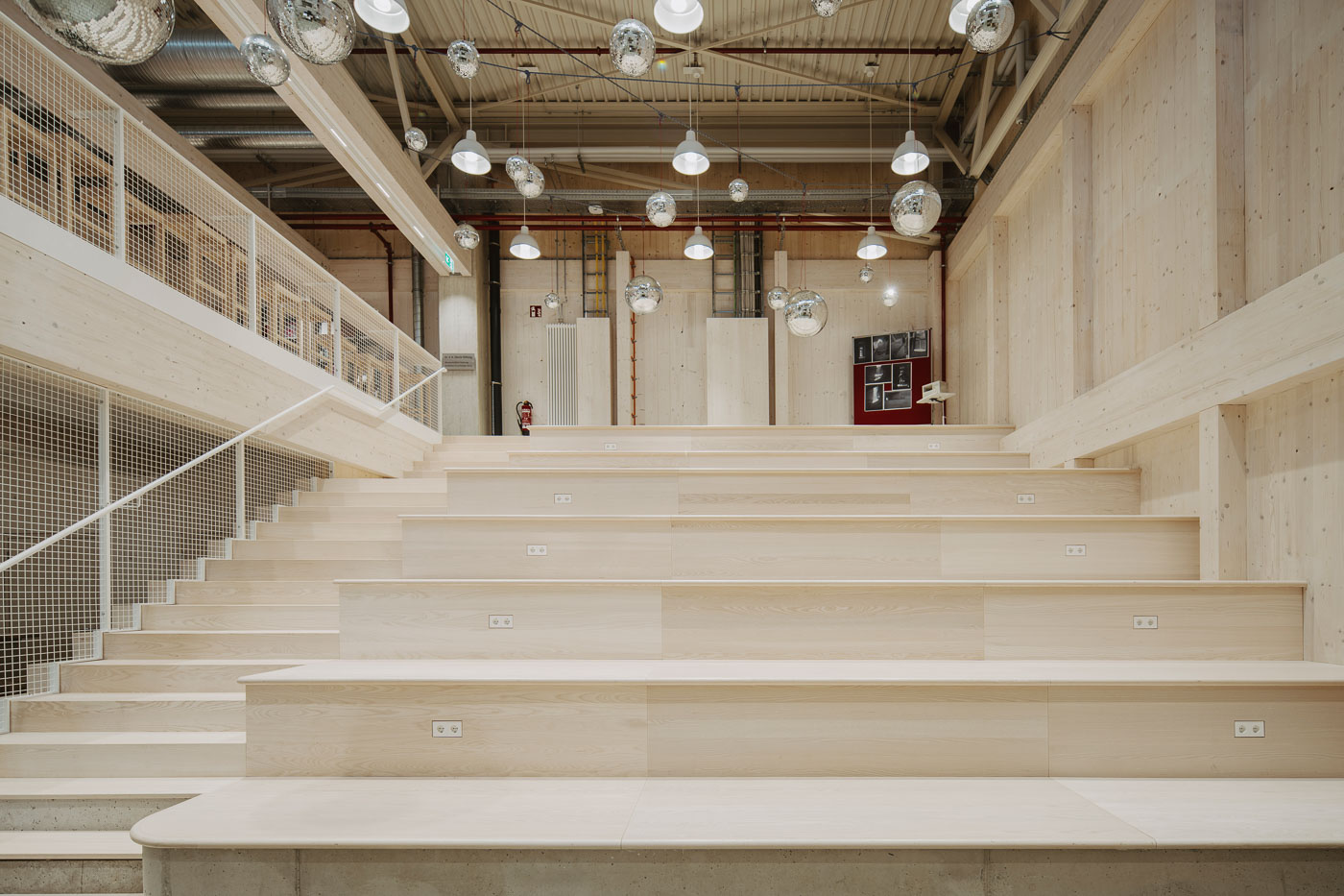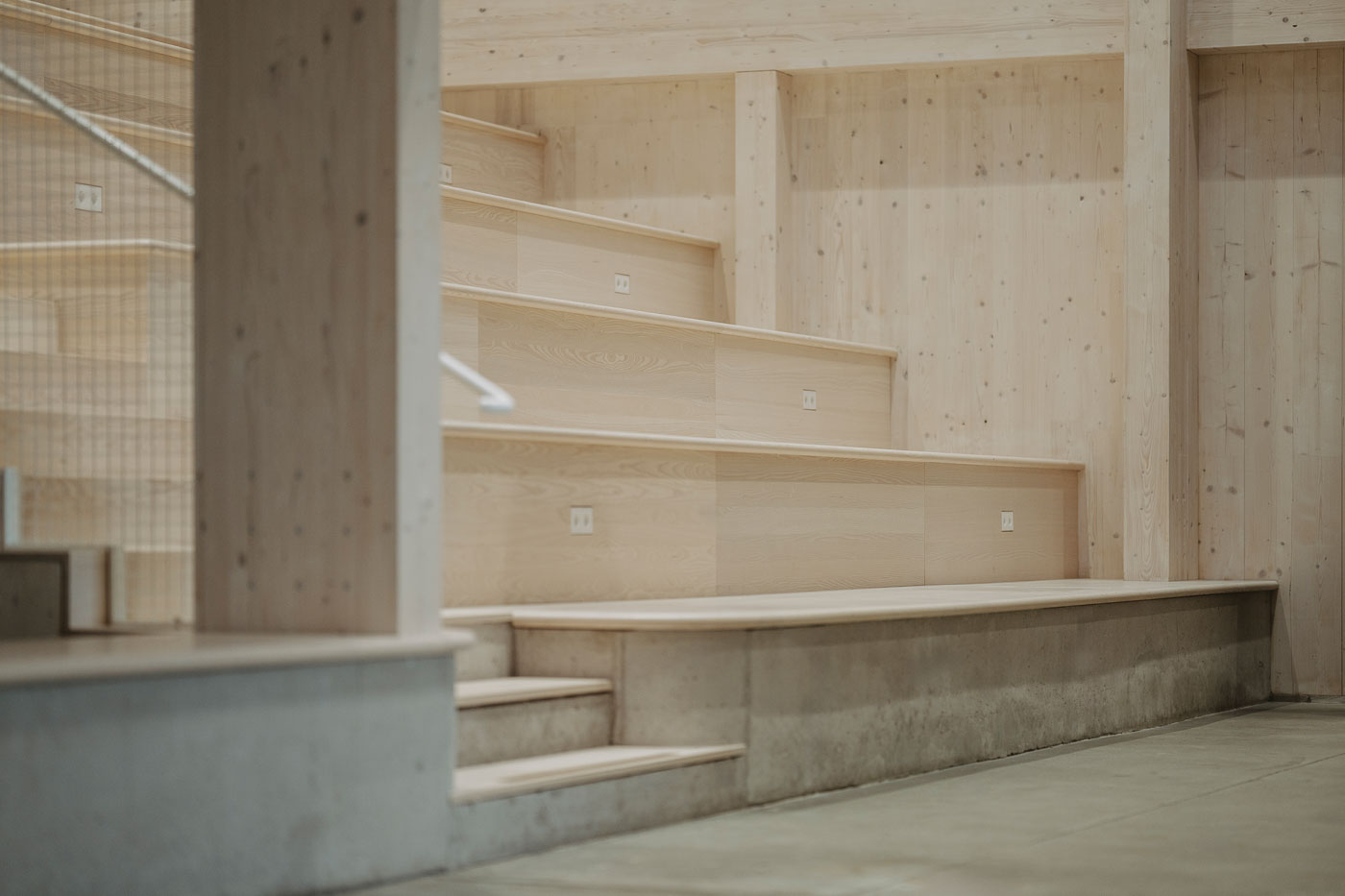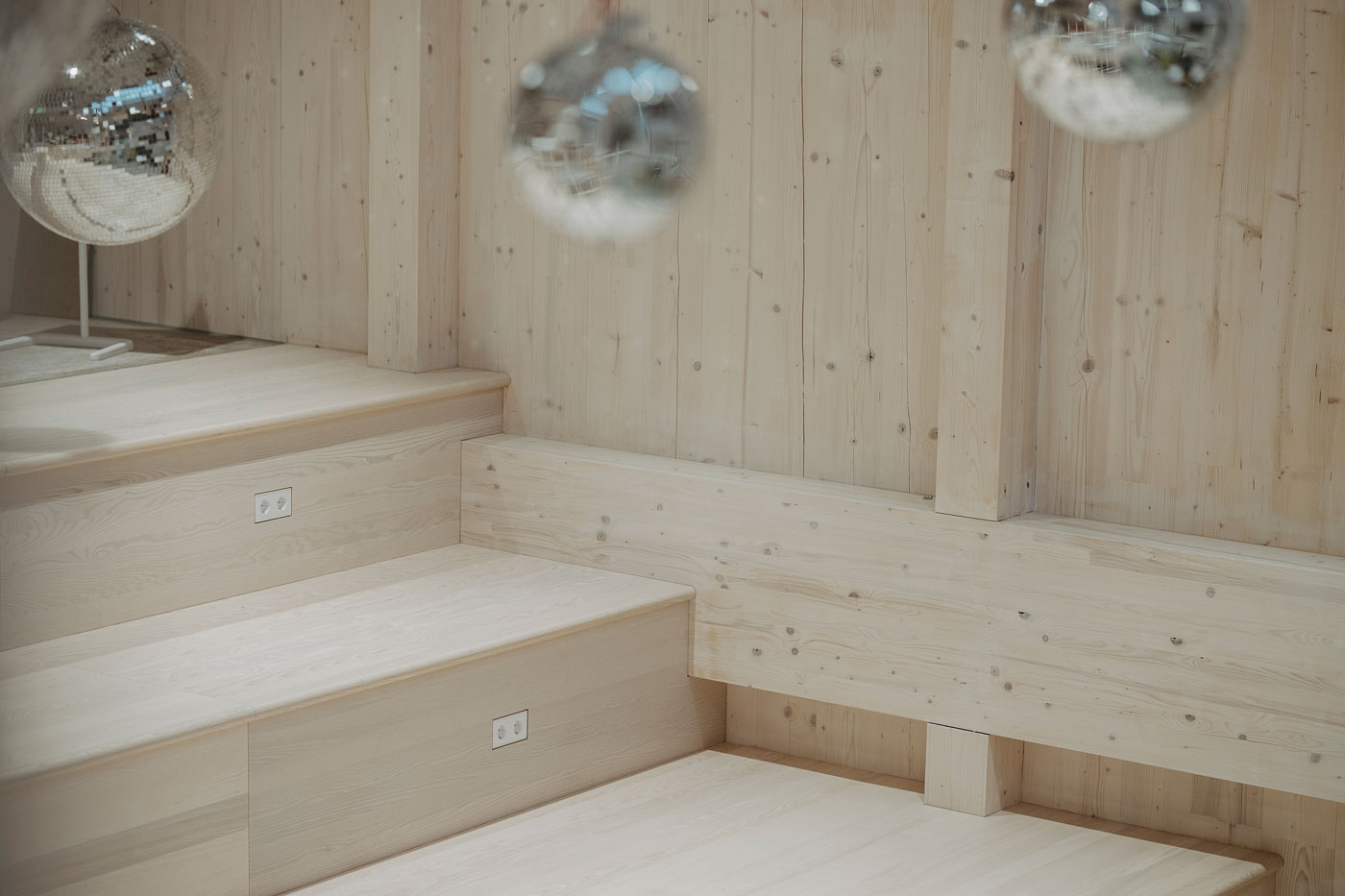 Ein prägendes Element ist die Sitztreppe: Treppenbelag und Holzverkleidung stammen ebenfalls aus unserer Werkstatt. Besonders sichtbar wird hier die handwerkliche Ausarbeitung der angearbeiteten Rundungen im Massivholz sowie die bündig integrierten Steckdosen, die Funktion und Gestaltung unauffällig verbinden.