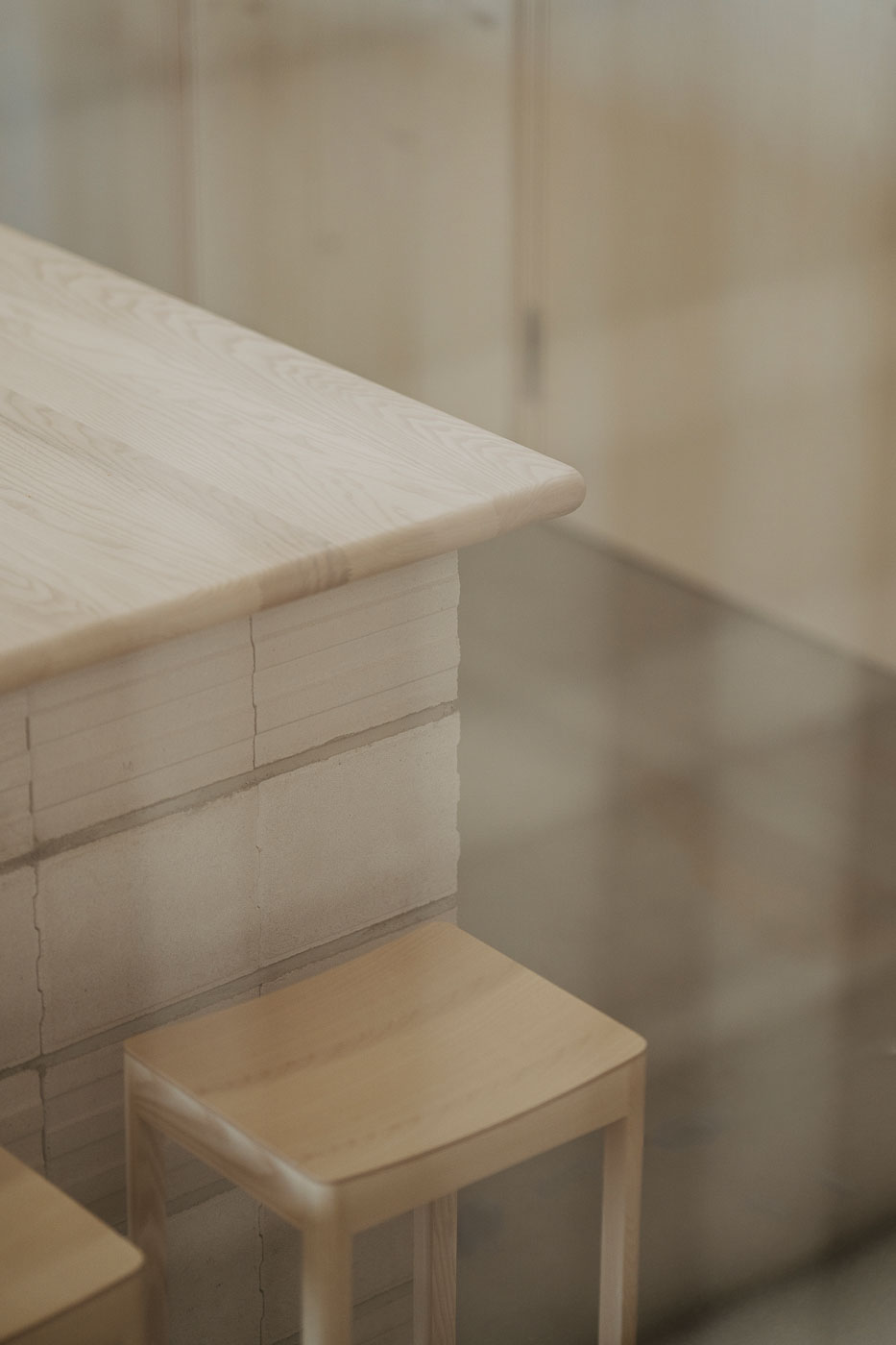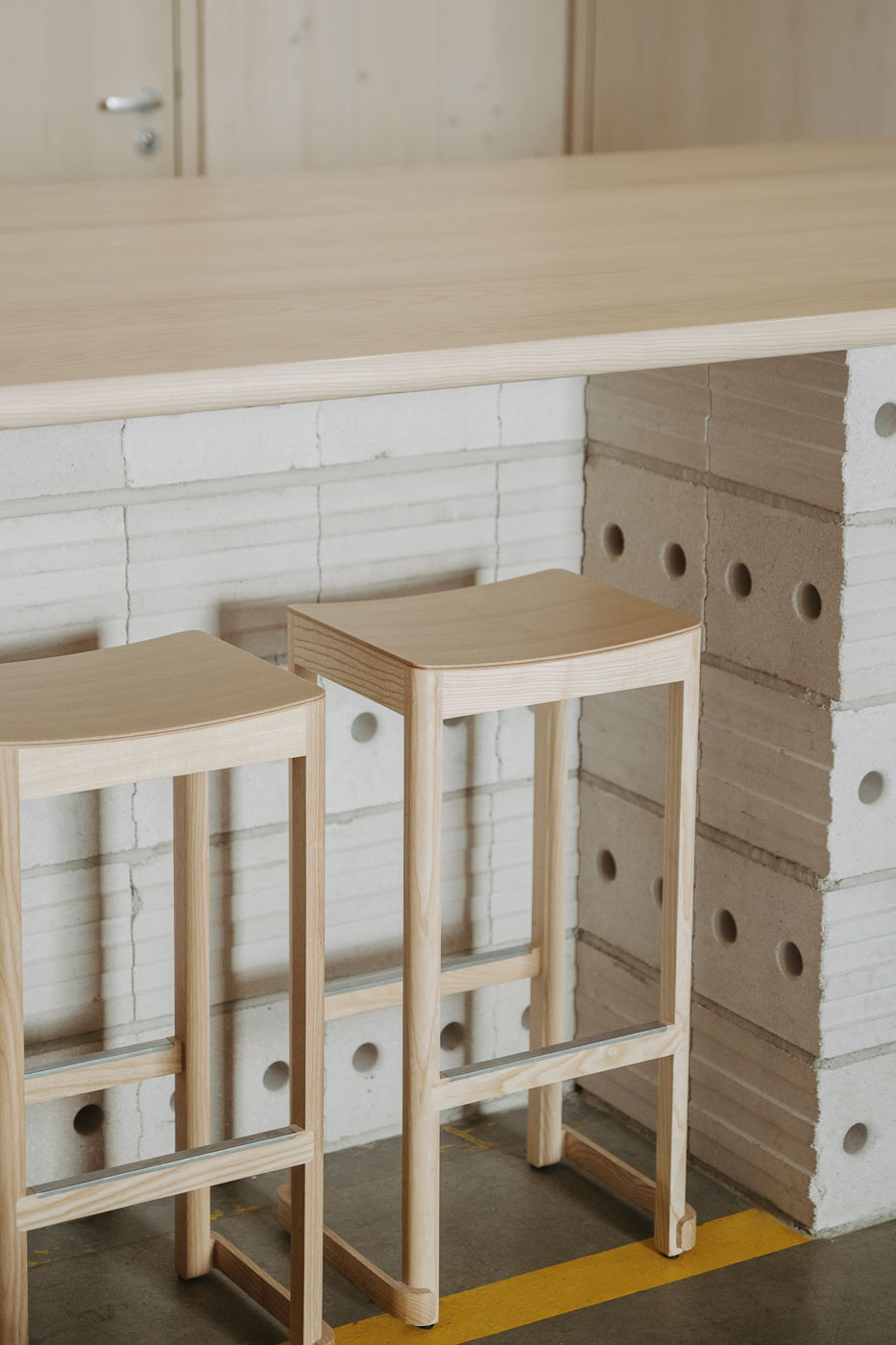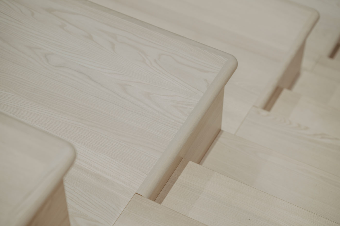 Alle Holzelemente bestehen aus massivem Eschenholz, weißlich lackiert, um die Räume hell, ruhig und langlebig zu gestalten. Auch die Abdeckungen des durch das gesamte Gebäude verlaufenden Betonsockels wurden von uns passgenau gefertigt und montiert. Detaillierte arbeiten wie diese zeigen perfekt den Übergang zwischen Architektur und Innenausbau schön auf und waren für uns bei diesem Projekt besonders wichtig.