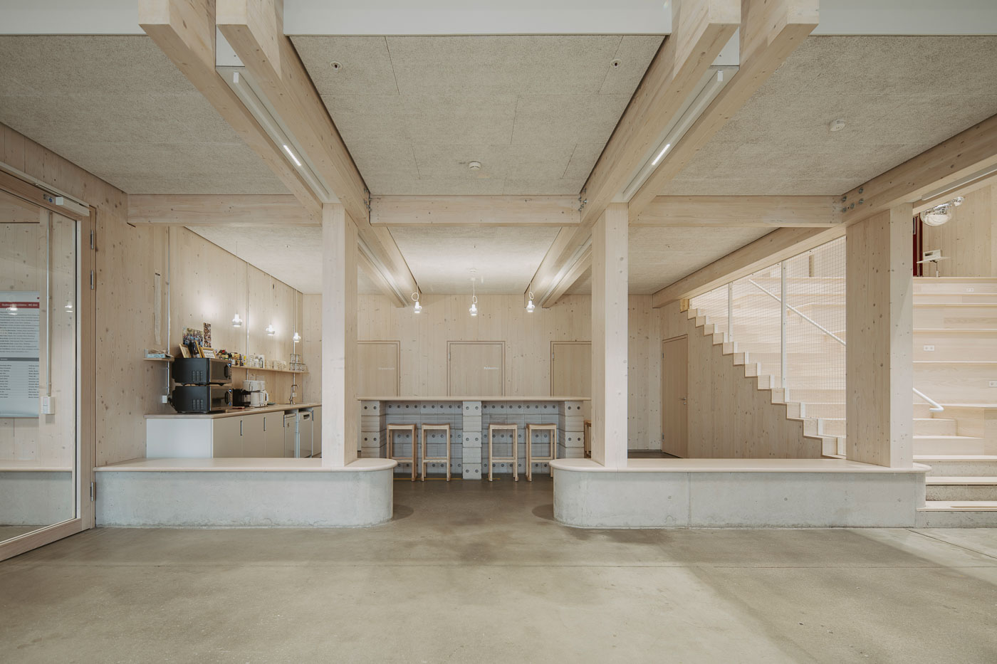 Im Eingangs- und Aufenthaltsbereich des Architekturcampus der DHBW Lörrach durften wir den Innenausbau rund um Küche, Theke und Sitztreppe umsetzen. Die Küche samt Thekenplatte wurde von uns gefertigt und bildet einen zentralen Treffpunkt im Gebäude.