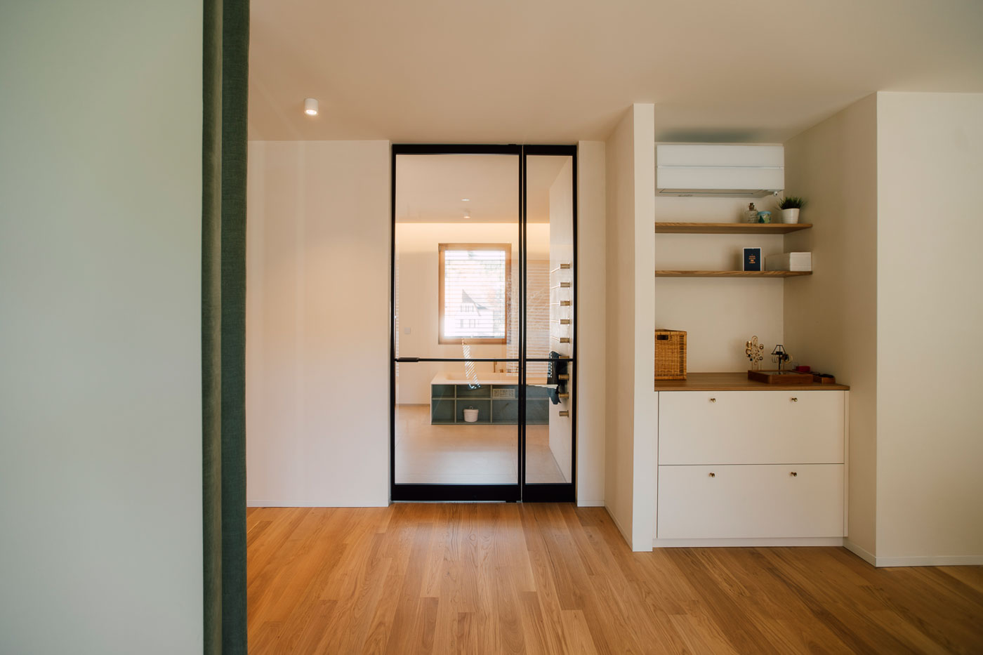 Ein technisches Highlight ist die von uns geplante und montierte Pivot-Türe zum Bad. Schwarze Aluminiumprofile und Glas sorgen für einen modernen Kontrast. Der Drehpunkt sitzt – typisch Pivot – leicht versetzt in Boden und Decke, was der Tür eine besonders elegante und ruhige Bewegung verleiht.