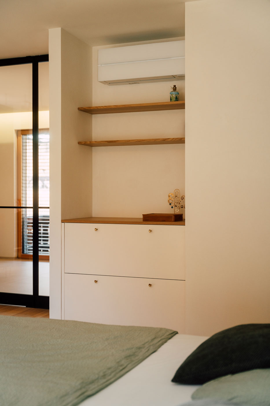 In einer kleinen Nische entstand zudem ein Sideboard im gleichen Farbton - mit goldenen Knopfgriffen und Ablagen aus Eiche, abgestimmt auf den Eichen-Parkettboden. Innen bietet es zusätzlichen Stauraum für Wäsche.