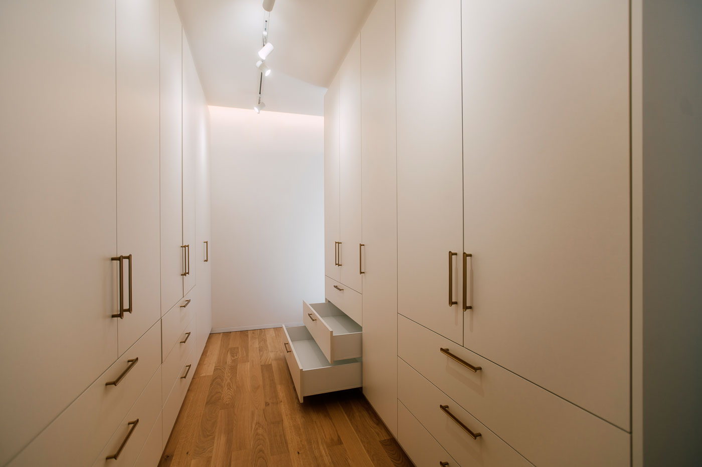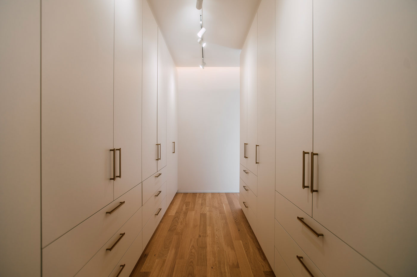 - Maßgefertigte begehbare Ankleide in sanftem Cremeton