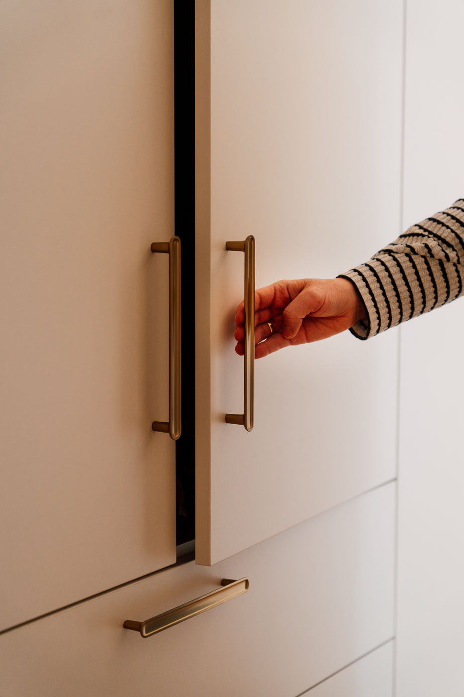 - Schlichte, moderne Griffe in Gold als warmes Akzentdetail