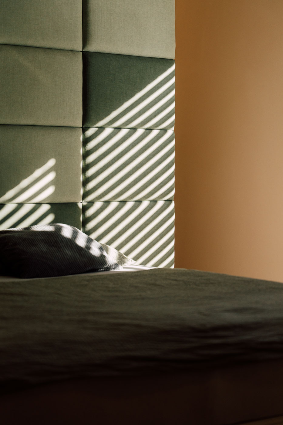 Dahinter bietet sie viel strukturierten Stauraum: Schubladen, Böden und innenliegende Kleiderstangen sorgen dafür, dass alles seinen Platz hat. Eine Seite der Ankleide dient gleichzeitig als Raumtrenner und wurde als gepolsterten Bettrückwand gestaltet. Die Polsterarbeiten stammen von Lohmüller licht und wohnen GmbH und verleihen dem Raum eine sanfte, wohnliche Atmosphäre.